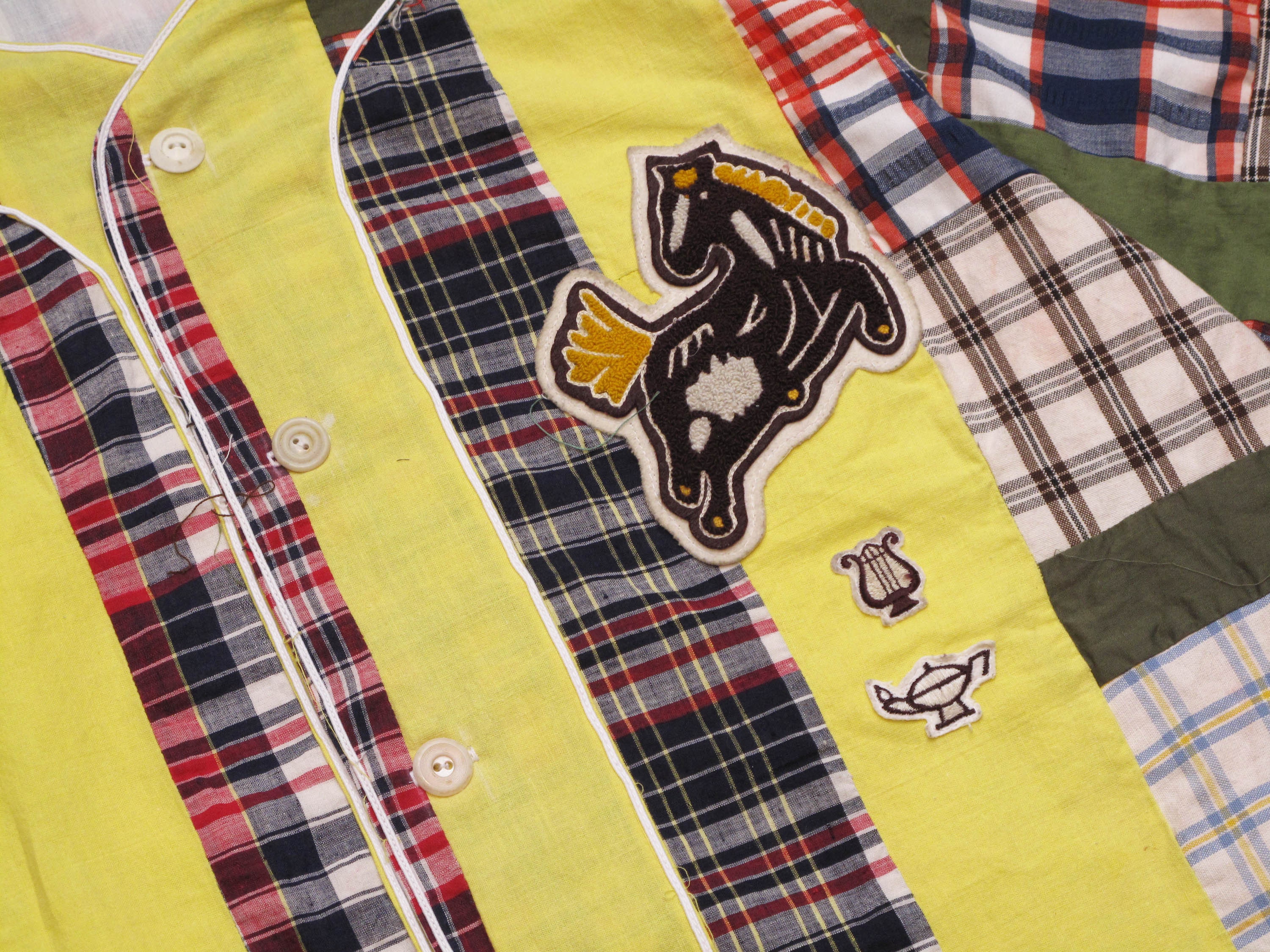 Shirts cut into roughly 11 by 11 inch squares.and surrounded by smaller white cotton squares.